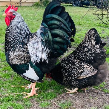 Our chickens have daytime access to over 1/4 acre of open outdoor space. They can be seen actively foraging for their natural diet of bugs, seeds, berries, etc. Additionally, we provide nutritionally balanced free-choice pellet feed and crushed oyster shells to maintain shell integrity.